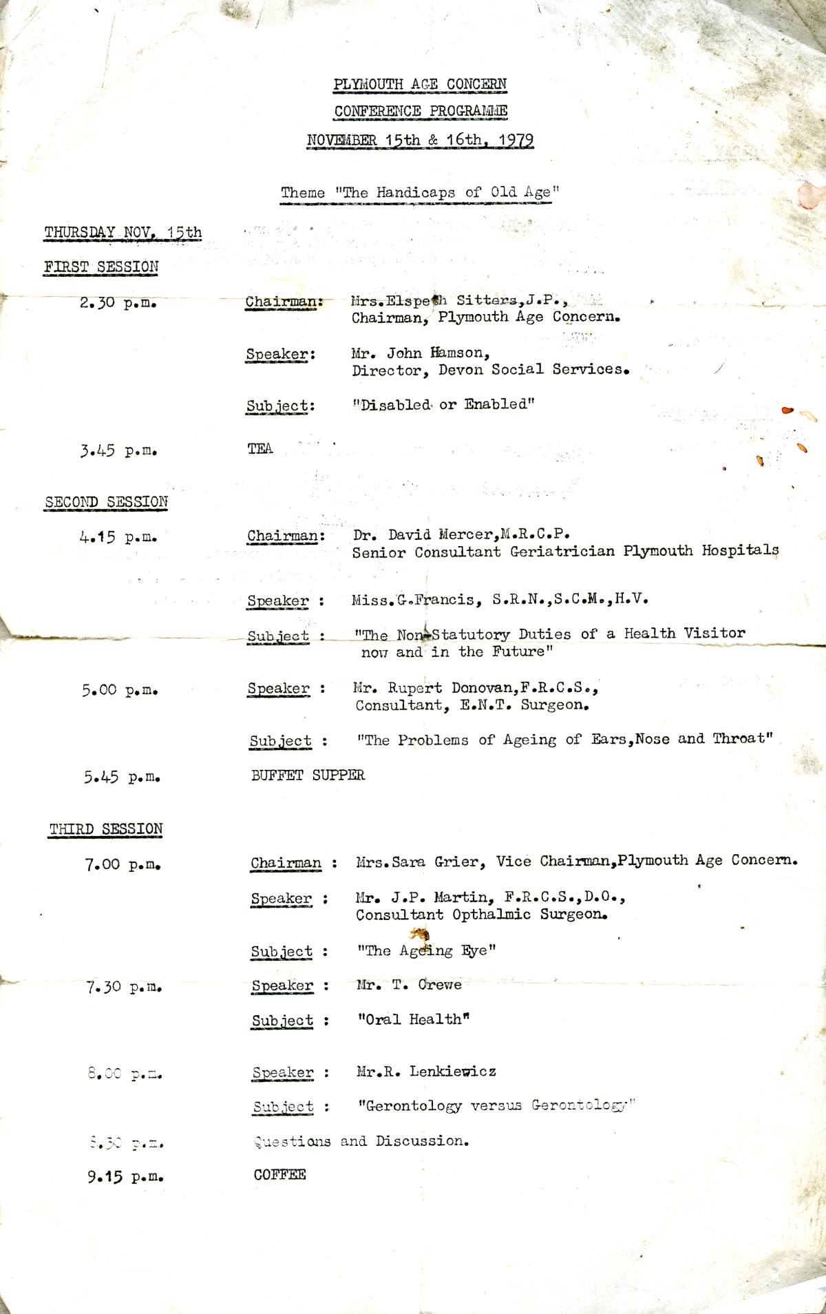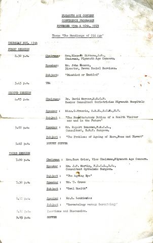 The Age Concern Conference Programme with Lenkiewicz’s talk: Geriatrics versus Gerontology (mistitled as ‘Gerontology versus Gerontology’)