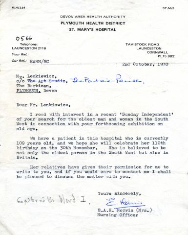 Correspondence from St Mary’s Hospital regarding a 109 year old resident (oldest woman in Britain)