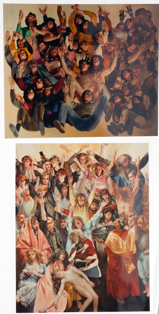 This study, structured loosely on ‘The Burial of Count Orgaz’ by El Greco, relates in atmosphere and design to KINDERTOTENLIEDER (Songs on the Deaths of Children) a cycle of five orchestral songs (1901-4), by Gustav Mahler. The poems were written by Friedrich Ruckert after the death of his two children. The fifth poem - ‘In this grim weather’ - transformed by Mahler, is of exquisite beauty. The central pillar of figures in the Deposition relate to the remarkable transition from bitter irony to unsentimental acceptance so movingly expressed by Mahler. The painting also relates to Robert Schumman’s Liederkreis Op.39, setting to music a poem by Eichendorff; Mondnacht:- “Es war als hatt der Himmel”. The painting relates finally, to Richard Strauss’s Vier Letzte Lieder; in particular, the Hermann Hesse poem “Beim Schlafengehen” These pieces of music may be heard within the vicinity of this picture. A book of notes and studies - not on view - detail a large number of cross-references relating to this work.