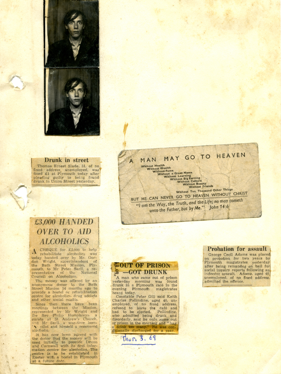 Vagrancy archive folioitem 3 (passport fotos) thurs 3. 69 330 x 205 mm passport fotos and new clippings with religious sentiment card