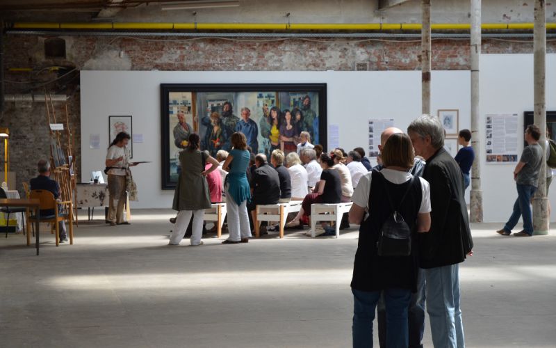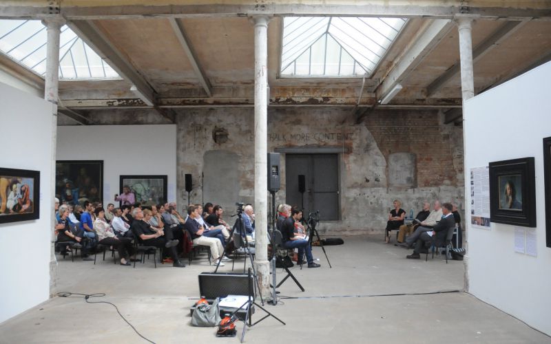 • Panel discussion, Sunday 23 June. The panellists were Prof. Arno Rink (holding microphone), artists Rayk Goetze (right) and Miriam Vlaming (left), and curator Francis Mallett (second right) from The Lenkiewicz Foundation. The discussion was moderated by Mark Gisbourne. — at Spinnerei, Leipzig.
