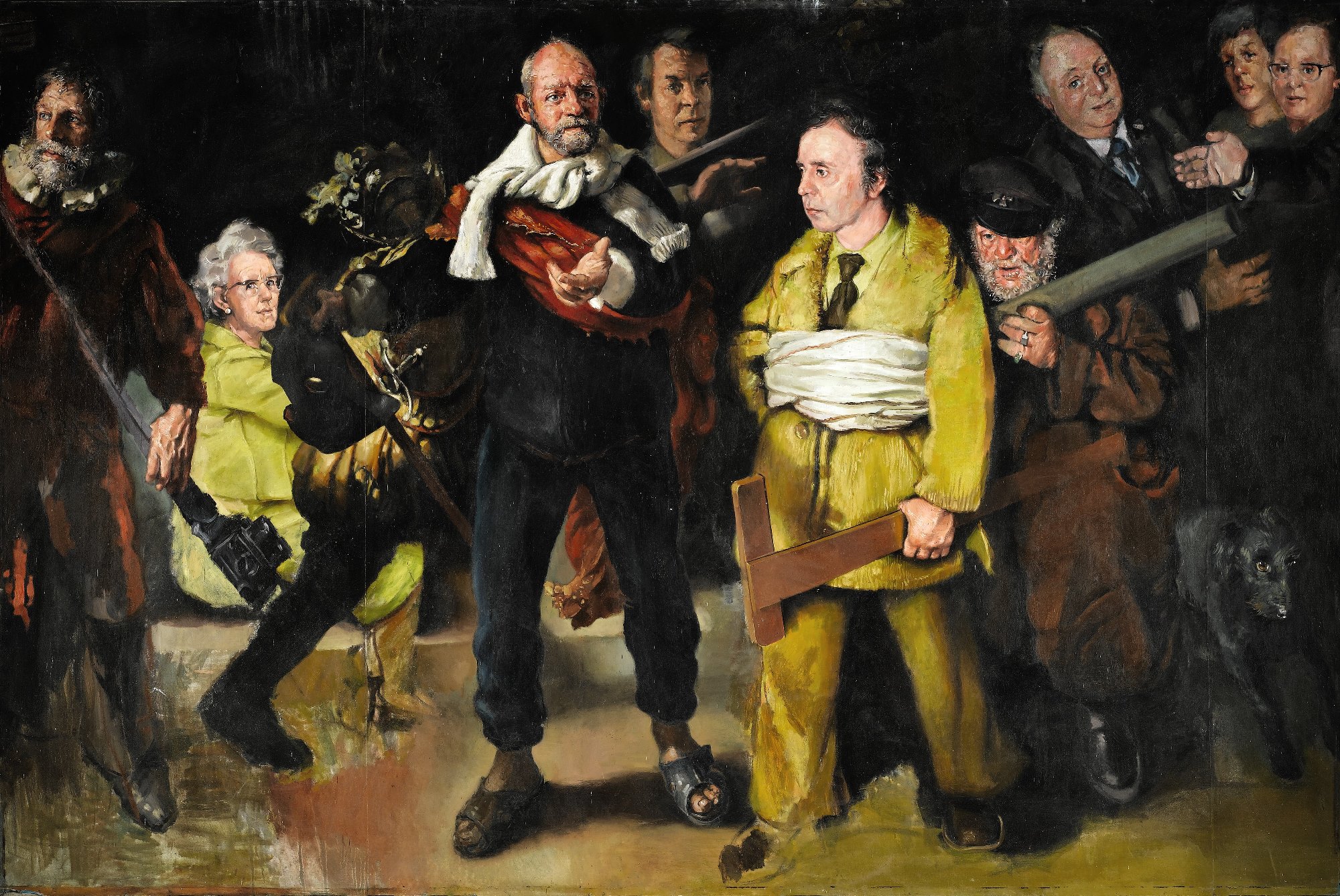 Originally almost the same size (304 x 426 cm) as Rembrandt’s painting of the same name before being cut to manageable size by the artist, The Night Watch was the centrepiece of the Mental Handicap Project in 1976 and was unveiled by Plymouth’s Lord Mayor, Arthur Floyd. Concealed behind a vast curtain at one end of the warehouse studio Jacob’s Ladder, this deliberately invoked the great unveiling scene in Alexander Korda’s 1936 film Rembrandt, which had first inspired Lenkiewicz to become a painter when he saw it on television as a boy.