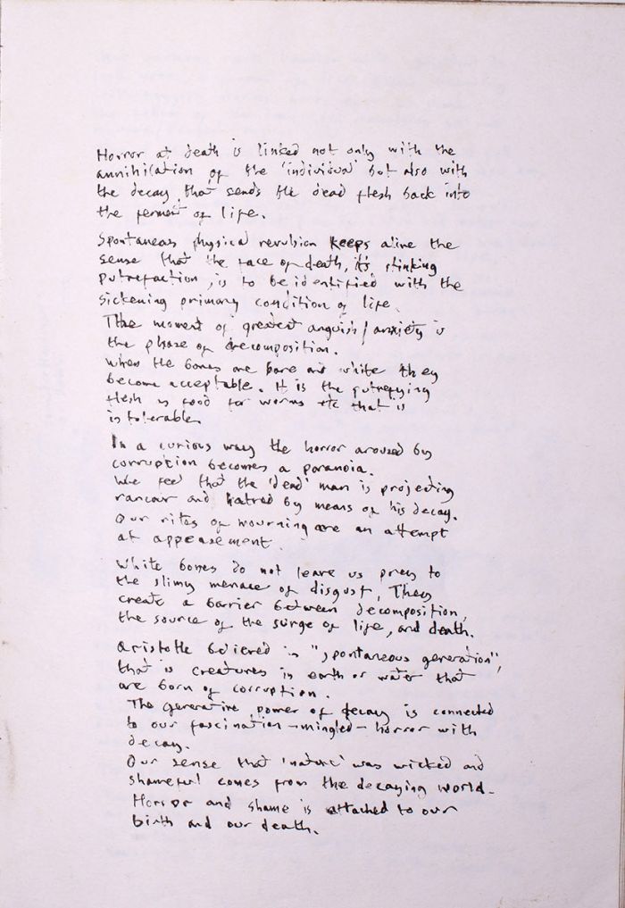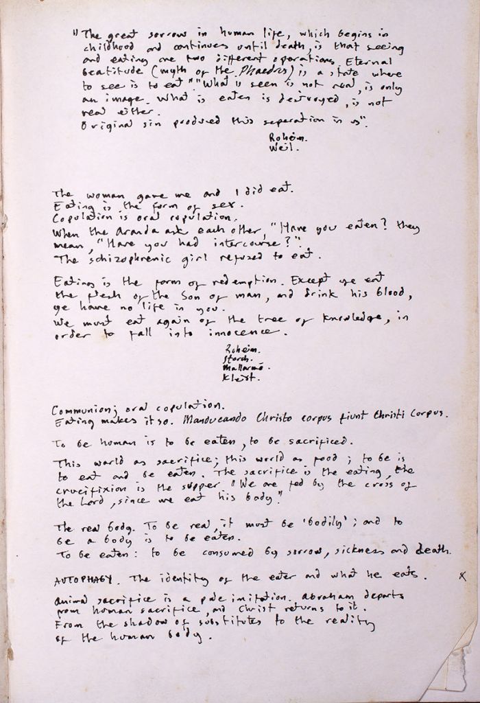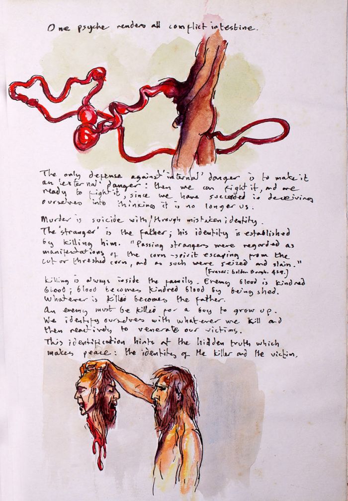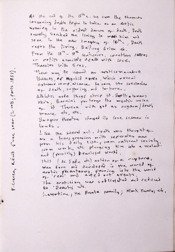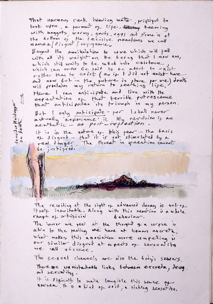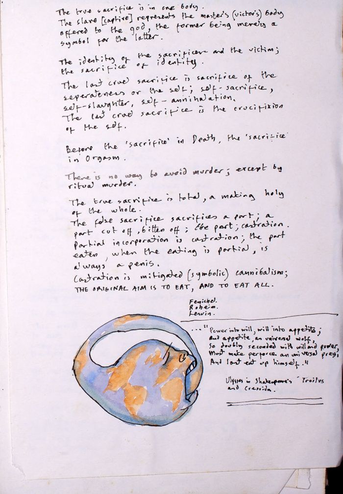 This notebook contains notes and illustrations exploring the themes of the 1978 Project of the same name. The majority of the text comprises Lenkiewicz's hand-written transcriptions of relevant texts from Georges Bataille, Philippe Aries and Norman O. Brown.
