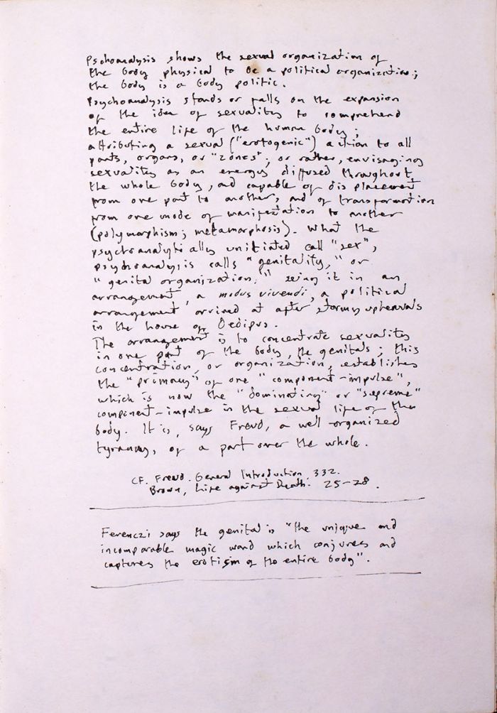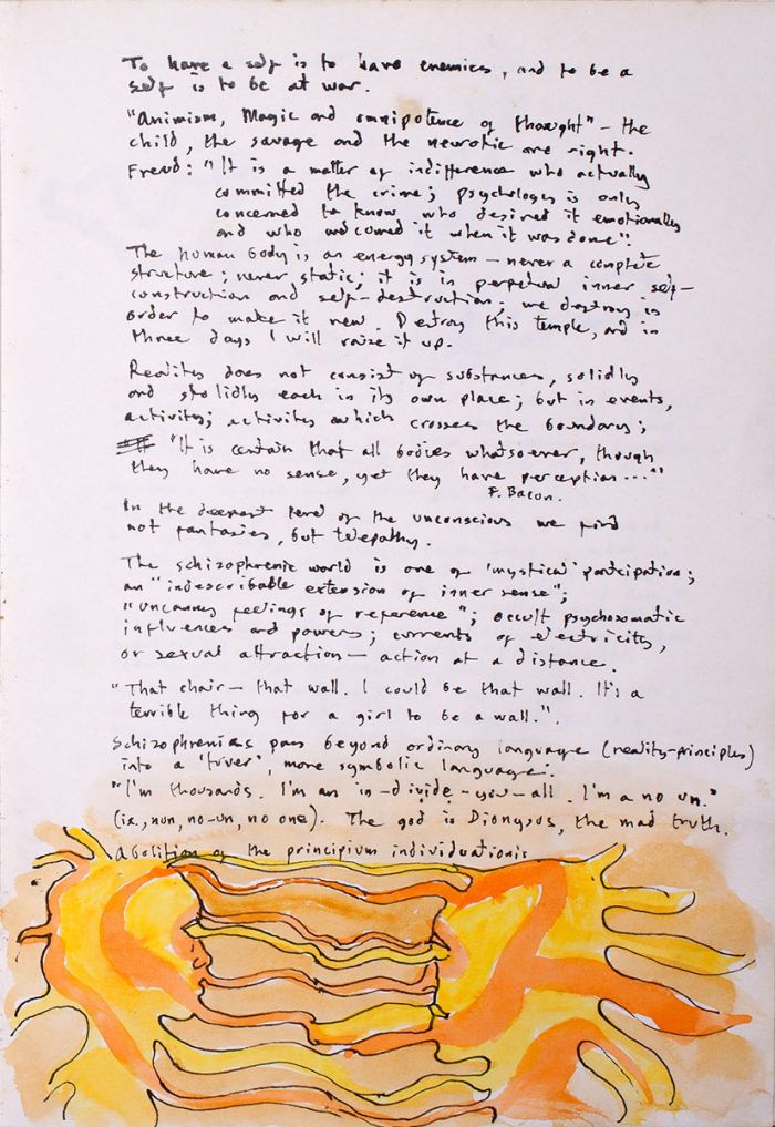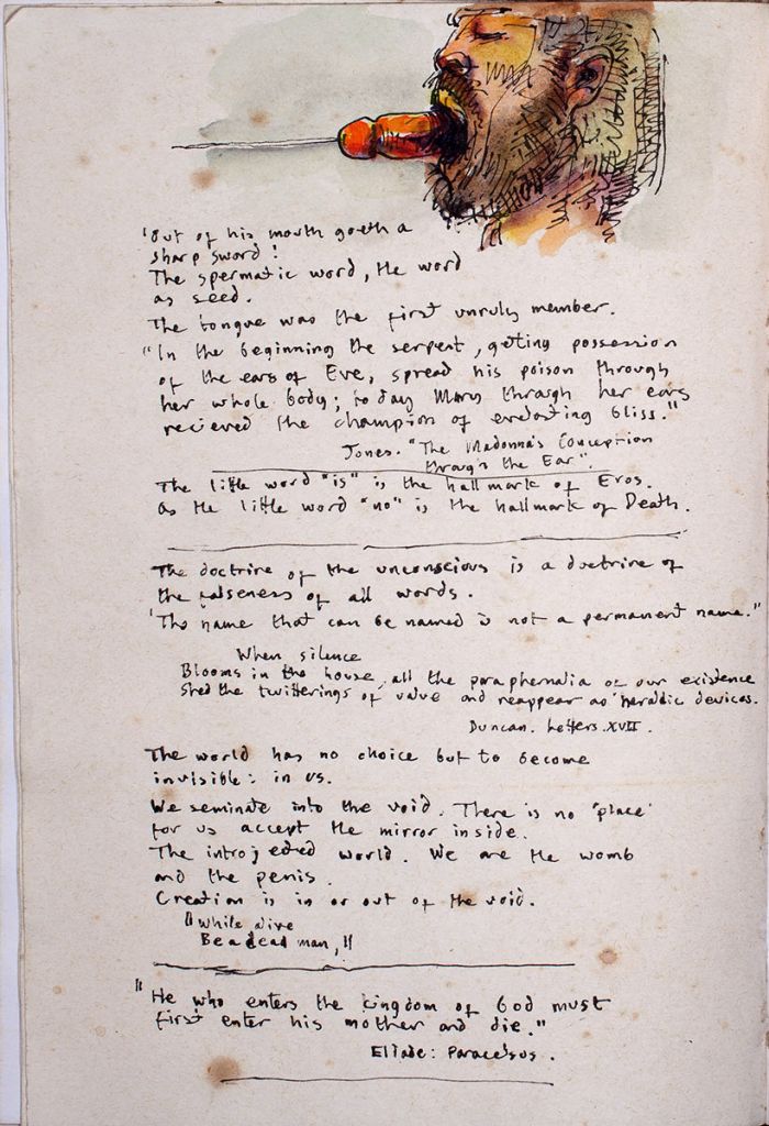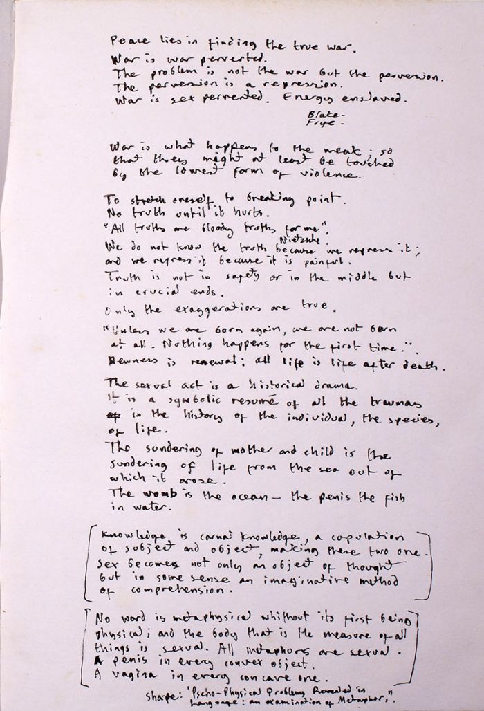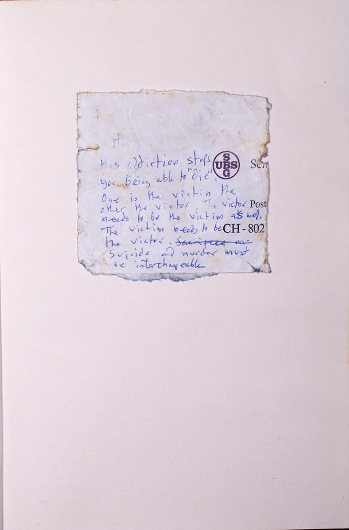 This notebook contains notes and illustrations exploring the themes of the 1978 Project of the same name. The majority of the text comprises Lenkiewicz's hand-written transcriptions of relevant texts from Georges Bataille, Philippe Aries and Norman O. Brown.