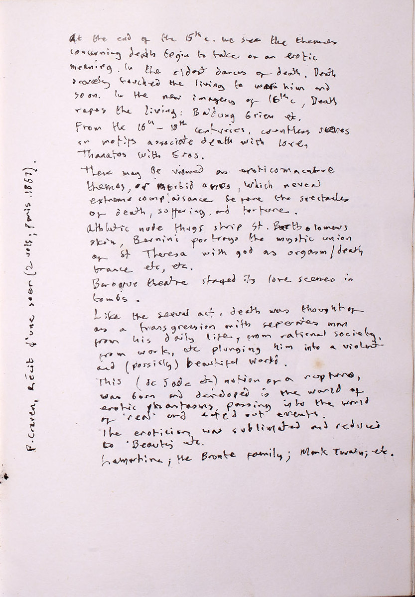 Like the sexual act, death was thought of as a transgression which separates man from his daily life, from rational society, from work, etc, plunging him into a violent and possibly beautiful world. This (de Sade etc) idea of a rupture was born and developed in the world of erotic phantasms, passing into the world of ‘real’ and acted-out events. The eroticism was sublimated and reduced to ‘Beauty’ etc. Lamartine; the Bronte family; Mark Twain etc.