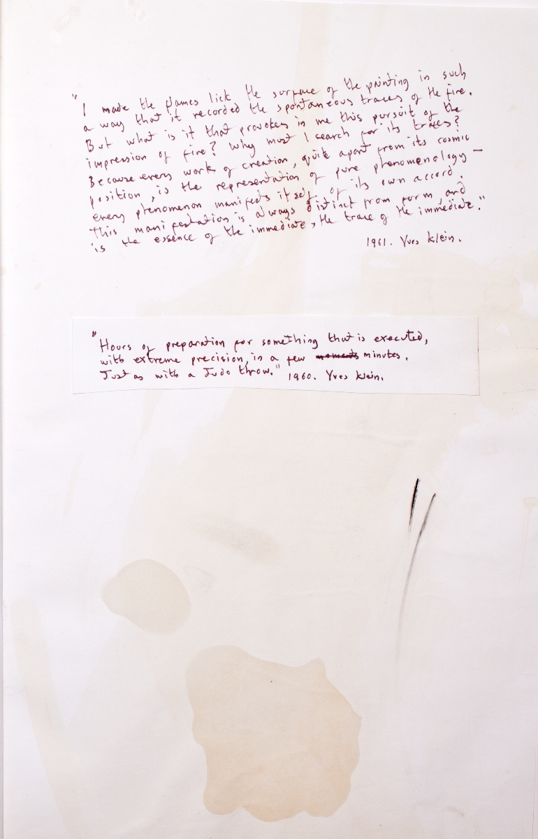 “I made the flames lick the surface of the painting in such a way that it recorded the spontaneous traces of the fire. But what is it that provokes in me this pursuit of the impression of fire? Why must I search for its traces? Because every work of creation, quite apart from its cosmic position, is the representation of pure phenomenology – every phenomenon manifests itself of its own accord. This manifestation is always distinct from form, and is the essence of the immediate, the trace of the immediate"