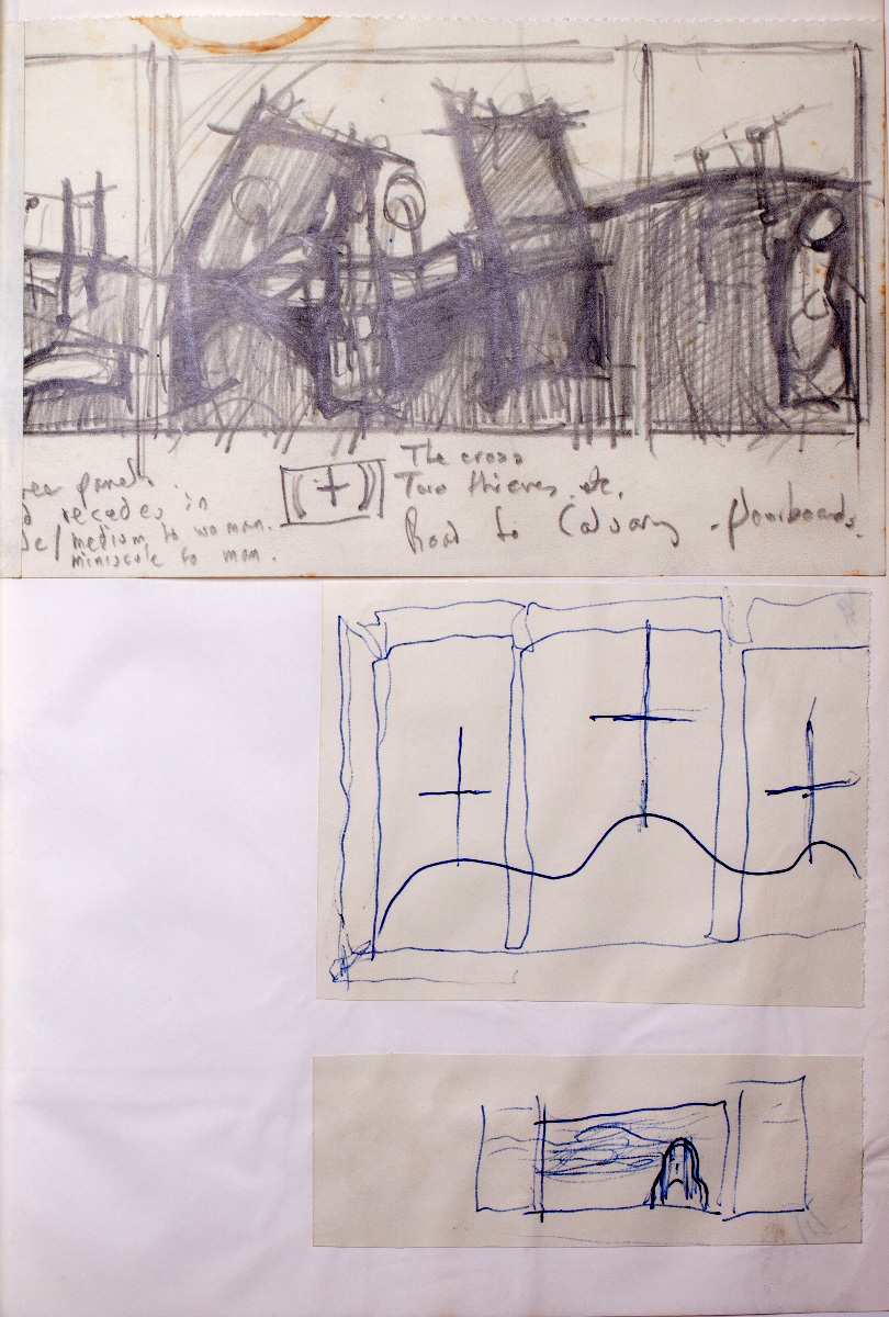 Love & Romance Project Notebook, 1975[some text obscured] The cross Two thieves, etc. Road to Calgary. floorboard.