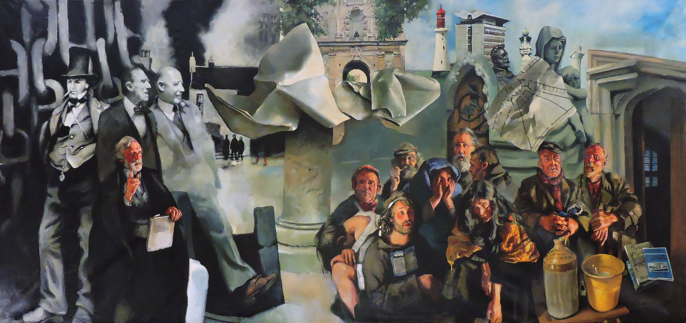 To the right we see the dispossessed whom civic progress has overlooked: Lenkiewicz, with a note around his neck reminding him to hurry up and finish the painting, and Myriam Rivera to his left; the vagrants ‘Wee Jock’, Diogenes, Dave Helingoe, Eugene, Bill, Cockney Jim and Bishop.