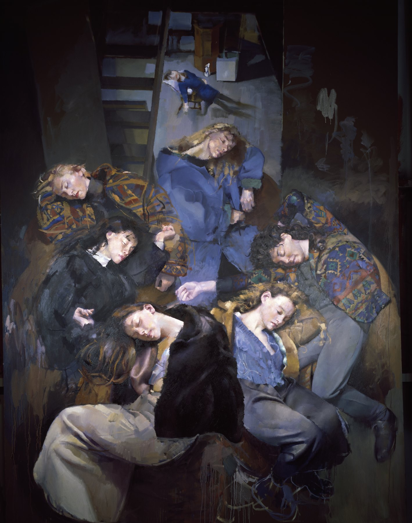 However, the arrangement of the sleepers in a circle probably refers to the ancient Jewish story of Choni HaMa’agel, or Choni the Circle-Drawer, a rainmaker who allegedly drew a circle in the dust during a particularly severe drought and informed God he would remain inside it until it rained. In another tale he is said to have fallen asleep concealed under a rock for 70 years, eventually to awaken and find that no one believes he is who he claims to be. Similar to the nineteenth century tale of Rip van Winkle, these stories present a select group or person who escape misfortune in their own times at the cost of being out of place in the world to which they have awakened.