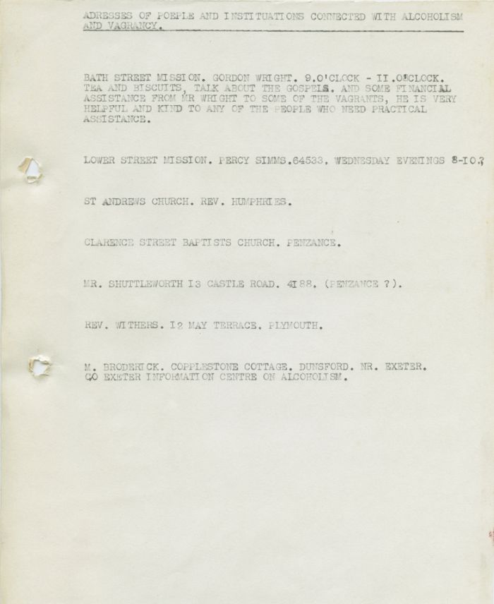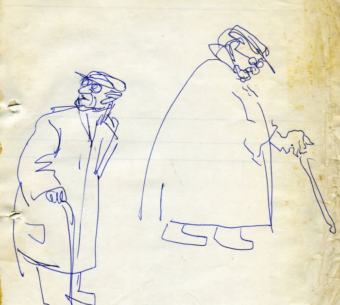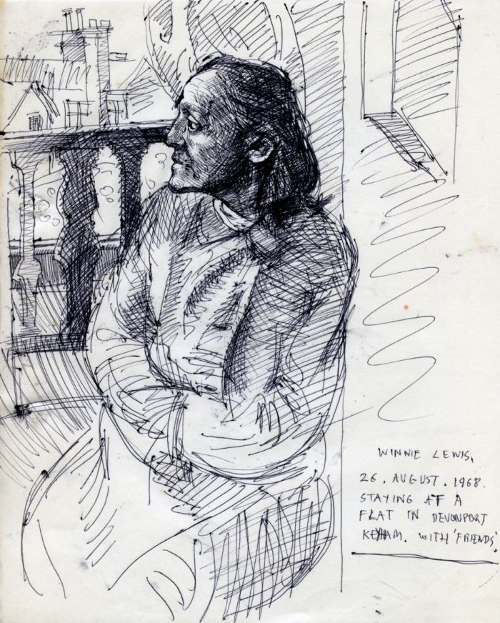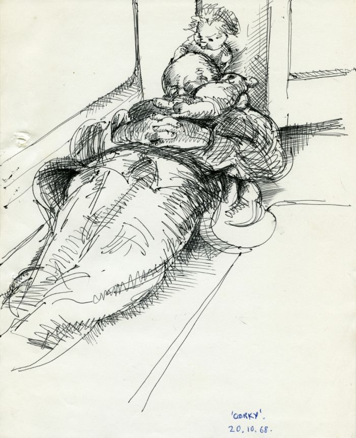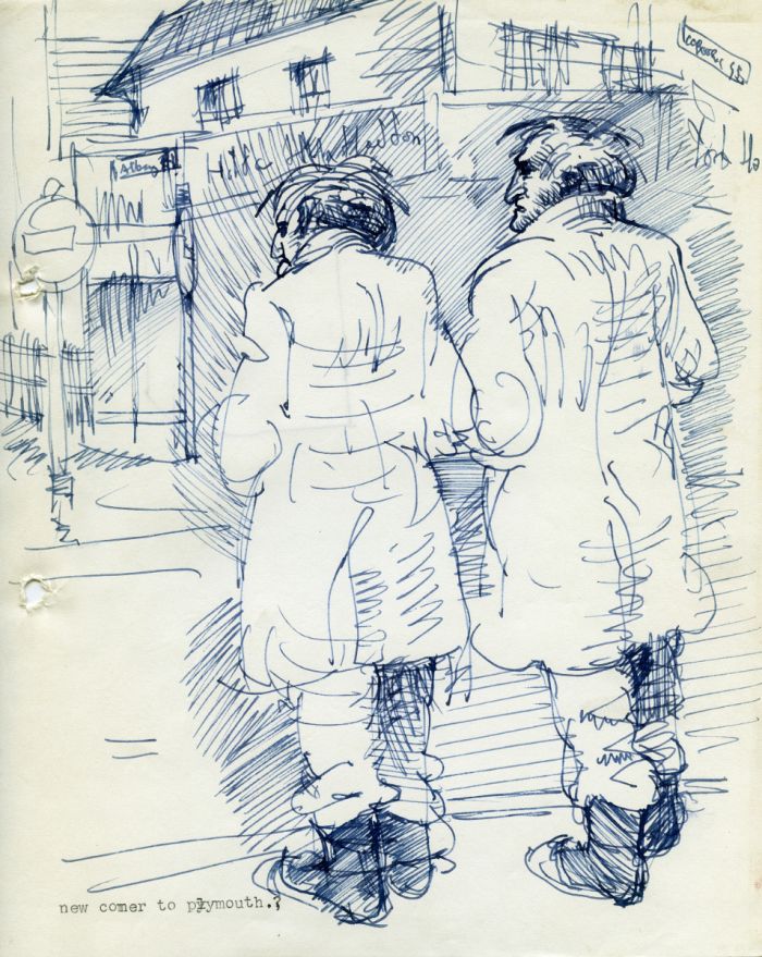 This folio of notes and illustrations dating from 1967-69 marks Lenkiewicz’s first attempt to document the lives of those he called ‘invisible people’. The sitters were frequent residents at Lenkiewicz own cramped dwellings, and were mostly lonely individuals struggling to maintain stable lifestyles. The names of some notable vagrants, such as Albert Fisher (Bishop) appear, but at this stage the notes are yet to be written, blank pages foreshadowing the large Project on vagrancy (1970-1973). A selection of these illustrations was exhibited in September 2019 at St Saviours Hall, Plymouth.
