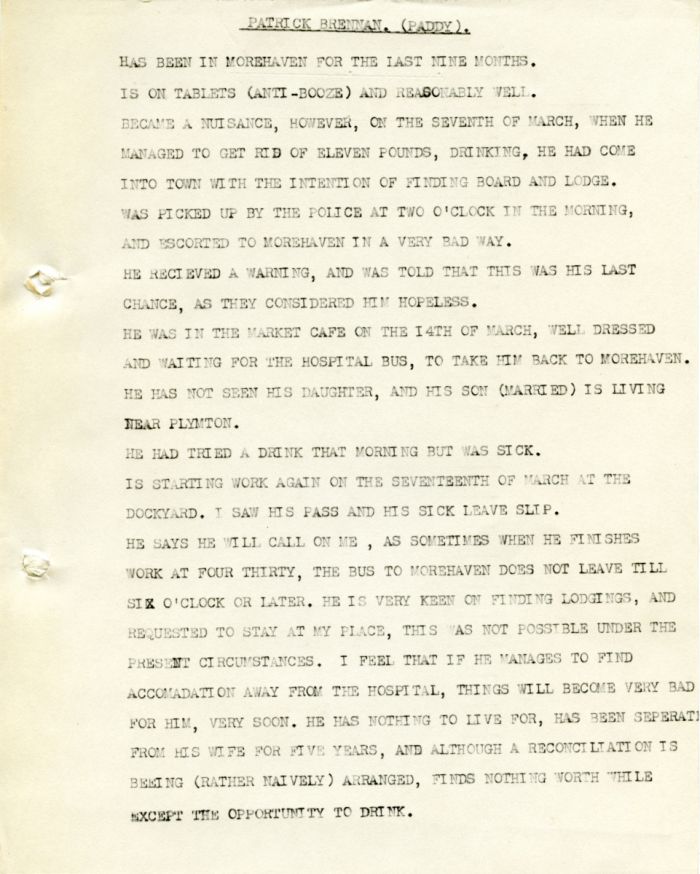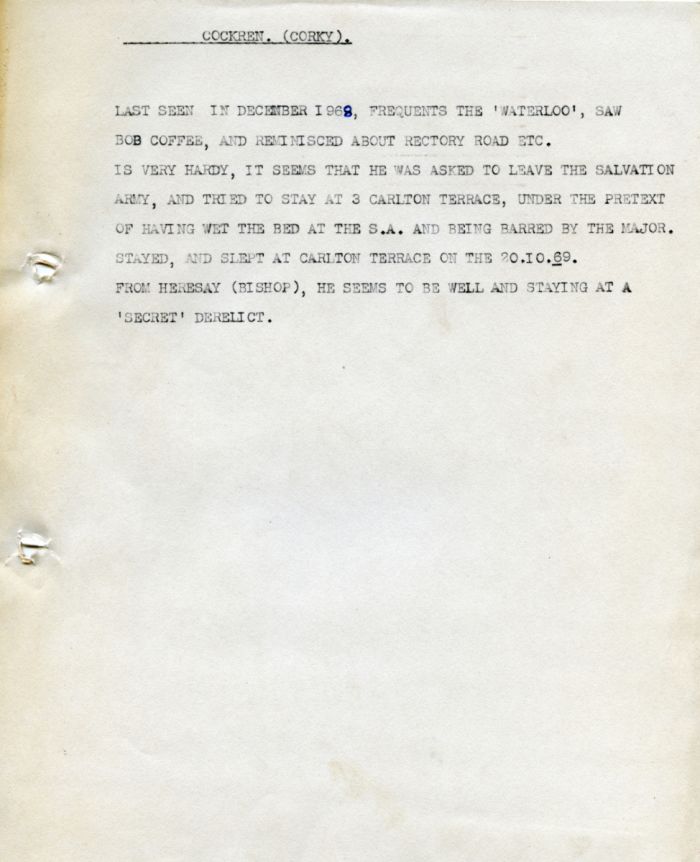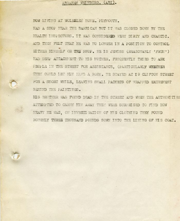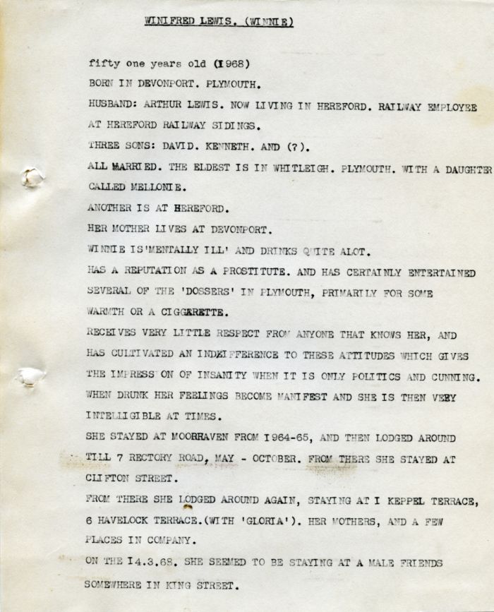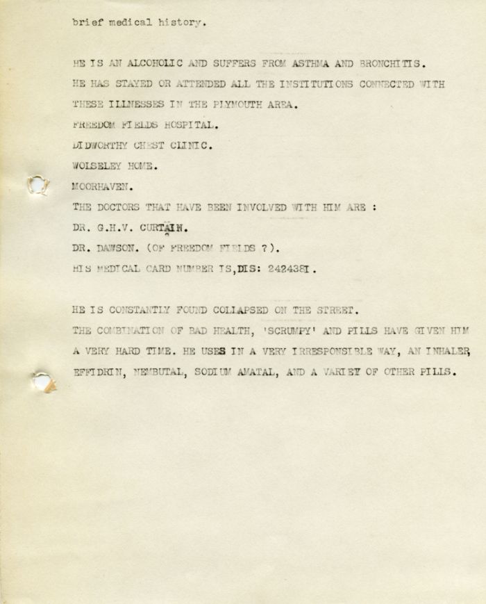 Lenkiewicz began compiling informal dossiers on his dossers, trying to keep track of their magistrate’s court appearances, stays at Moorhaven Hospital, or difficulties at the local Salvation Army hostel, from which many had been ejected for poor behaviour. And of course, he drew and painted them.
